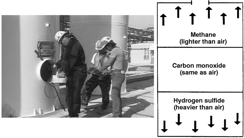 These meters check oxygen, carbon monoxide, and hydrogen sulfide levels, and check for the presence of flammable vapors in the atmosphere.