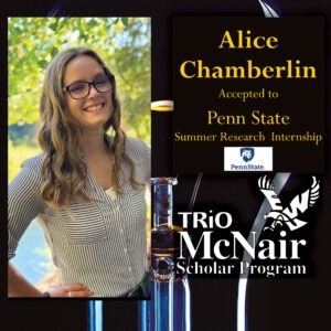 Congratulations to McNair Scholar, Alice Chamberlin! Alice has been accepted to Penn State’s Summer Research Internship. Penn State’s Summer Research Opportunities Program (SROP) is in it’s 37th year, with 610 program alumni completing their Ph.D. degree. SROP is run by the Big Ten Academic Alliance universities in order to increase the pursuit of graduate studies and research careers by underrepresented students.