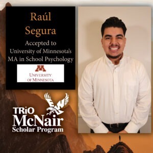 Congratulations to McNair Scholar Raúl Segura! Raúl has been accepted to the University of Minnesota Master of Arts in School Psychology Program. University of Minnesota uses an anti-racist scientific-practitioner orientation with a focus in practices and systems to advance justice and equity.
