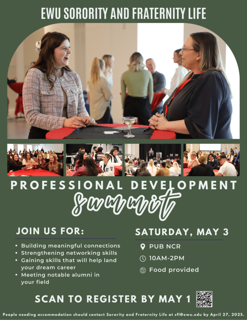 We are so excited to host the 3rd annual Summit! This event is open to all sorority and fraternity alumni, current EWU students, and EWU staff and faculty. This event focuses on building skills in networking to propel sorority and fraternity members into their future careers. Please reach out to sfl@ewu.edu with any questions!