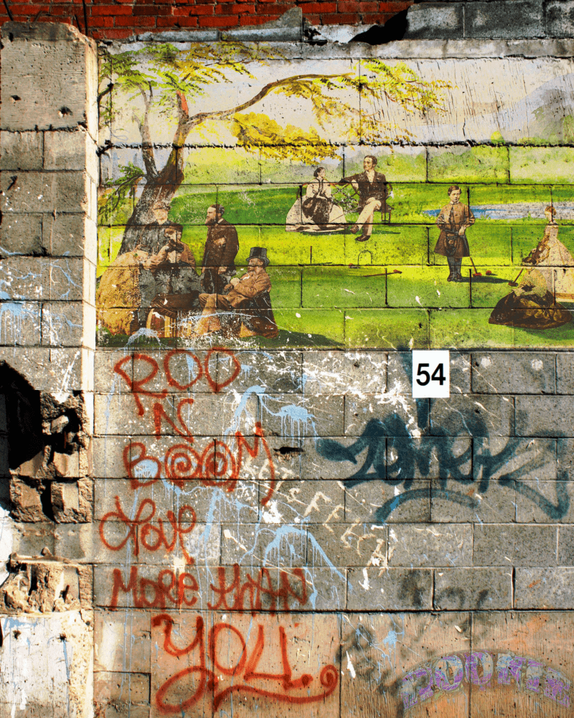 Oh, I love that so much. Yes, I agree, and I think that’s part of what led me down the road to visual poems. My husband loves graffiti. He’s a visual artist, that’s how he makes his actual living, and so whenever we’ve traveled someplace together, I think because I had the purse—this is just so sexist—I carried the camera. “Nance, get the camera out, shoot this, shoot this.” Mostly he wanted me to shoot images of graffiti. He loves the bold vibrance of them, and I really came to appreciate them, too. So I would take all these shots of graffiti, but there would be text mixed in with it, and I love that, too. I remember one of the first ones I shot. I think it’s somewhere in Spokane. I started packing along the camera, even sans husband, just for myself when I was out doing my urban walking. And there was “Roo ‘n Boom love more than you.” I thought, okay, that’s a perfect little poem. So when I took that photograph I didn’t add any text because I loved that language it already had. To make it mine, to make that wall, that brick wall with graffiti on it belong to me, I needed to enter the conversation. So, instead, I added some imagery, a scene from the 1890’s of women in big hats, and then I made it look like it had been on the wall for a really long time. That was one of my first stabs at interacting with the graffiti. Usually, however, I try to add a few words just to be a part of the conversation on the wall, which is another thing that I like about graffiti. It’s a place for anybody. You don’t have to be famous to have your say. I can send you a copy. Is this going to be online? You can put it up with the interview. [See the bottom of the page for the image.]